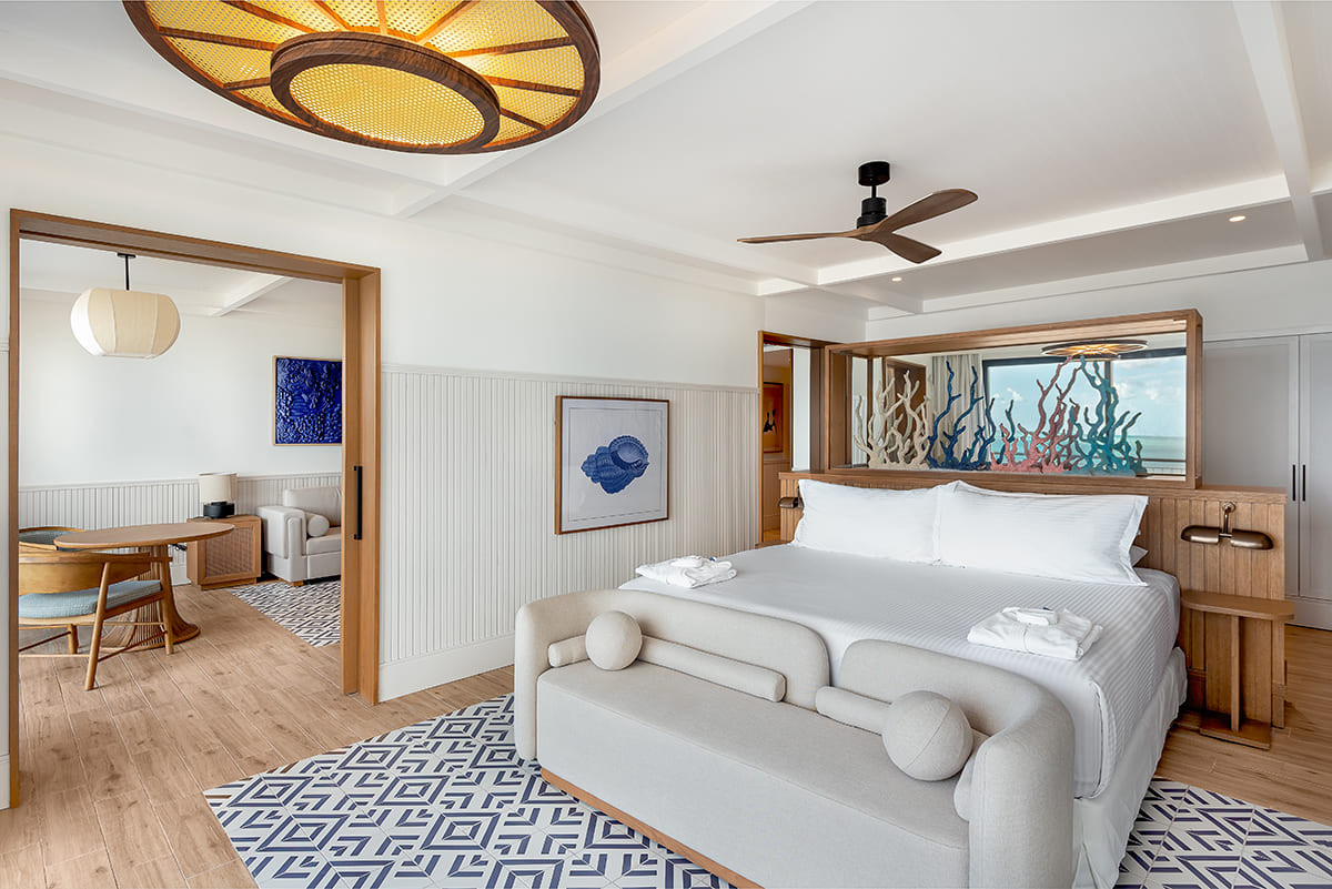 All Suites at Ocean Allure Costa Mujeres are spacious and bright, with contemporary design inspired by the marine environment. Designed in light tones and high-quality materials, the headboards stand out, presided over by tapestries printed in bright colours of women in a Caribbean setting.
