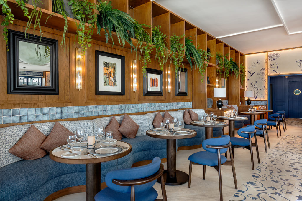 The lobby, designed in collaboration with the Lázaro Rosa-Violán studio, features two large-format female busts and large windows that allow natural light to enter and offer direct views of the gardens, swimming pools and the sea. The reception, with a mural representing a marine scene, is also located in this area.